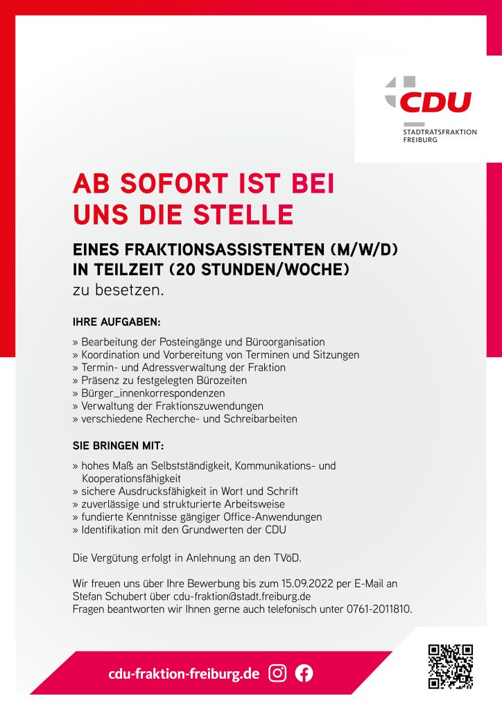 Ab sofort ist bei uns die Stelle eines Fraktionsassistenten (m/w/d) in Teilzeit frei.
